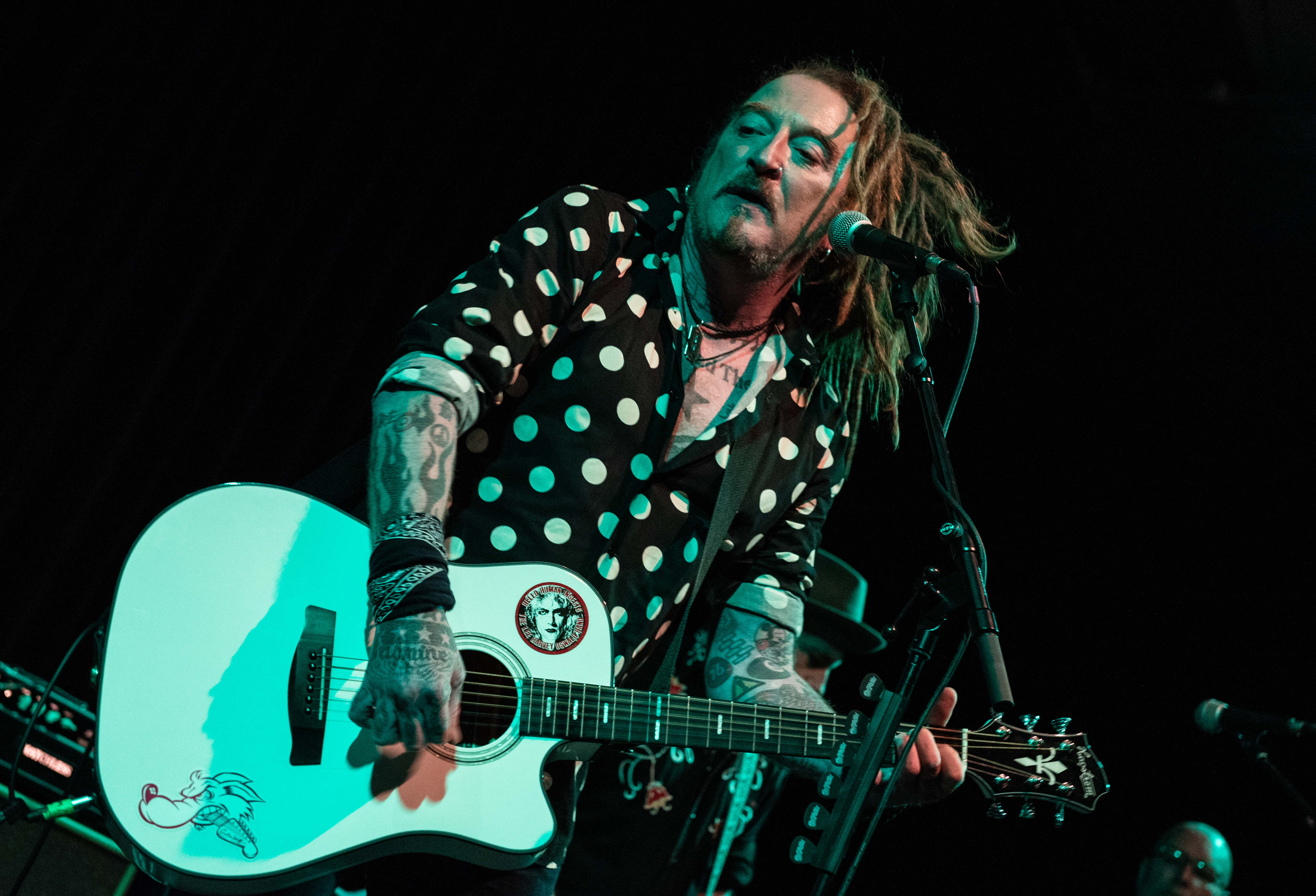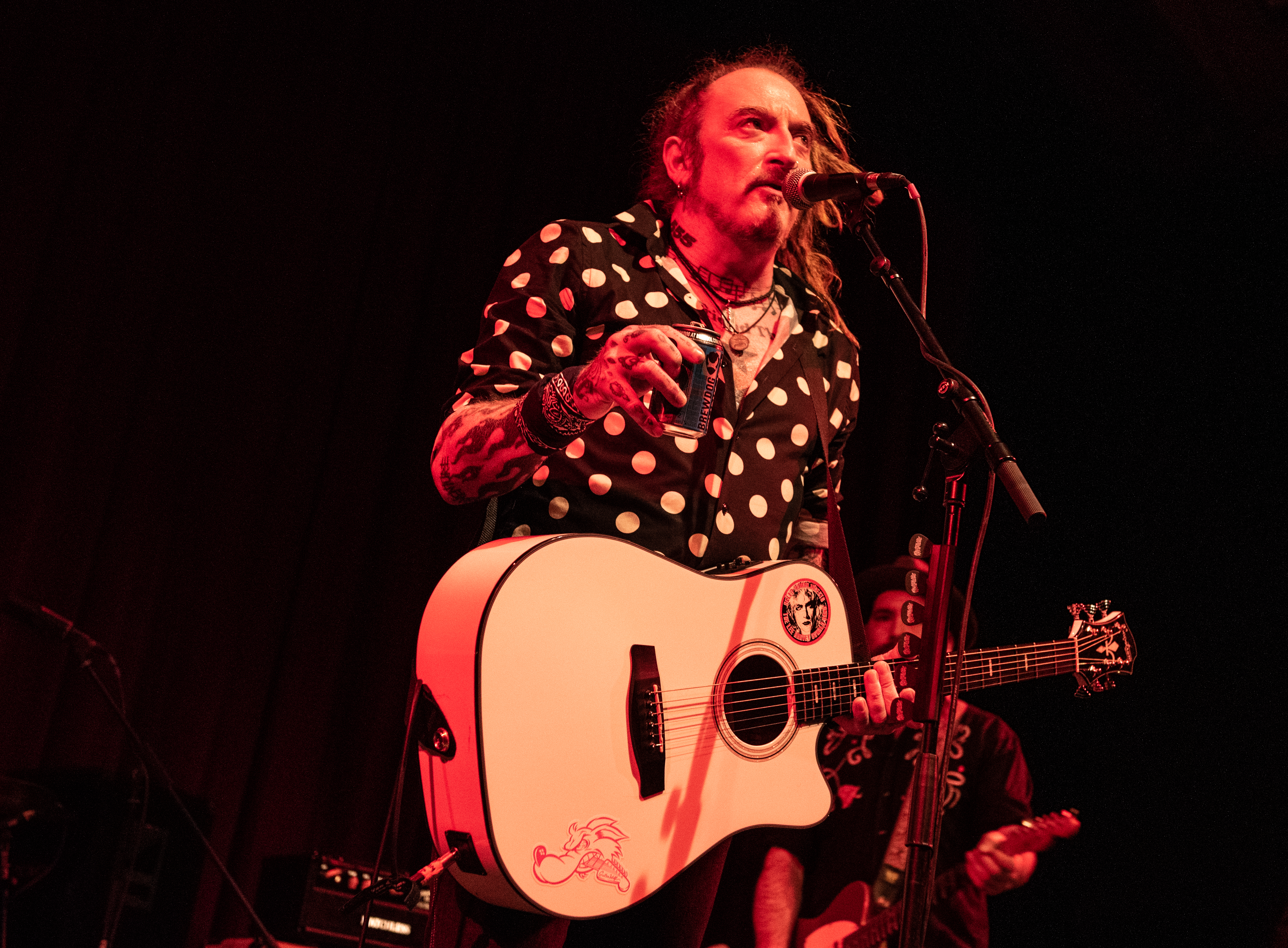 Much of the material from Ginger Wildheart And The Sinners is personal and cathartic in nature and, like Lauren Tate‘s earlier set, it covers taboo and personal subjects, including an absolutely stunning ‘Daylight Hotel‘ that addresses Ginger’s struggles with mental health. Rather than treading a melancholic path this is an uplifting and positive set, something that is underlined when he is joined onstage by a sixth Sinner, his son, twice during the set and the arrival of the seventh Sinner, his dog Molly, who practically stole the show, she undoubtedly charmed the crowd occupying the front rows as only a four legged companion can as she ran round the stage and the front rows emanating an aura of sheer happiness that human beings struggle to even briefly attain.